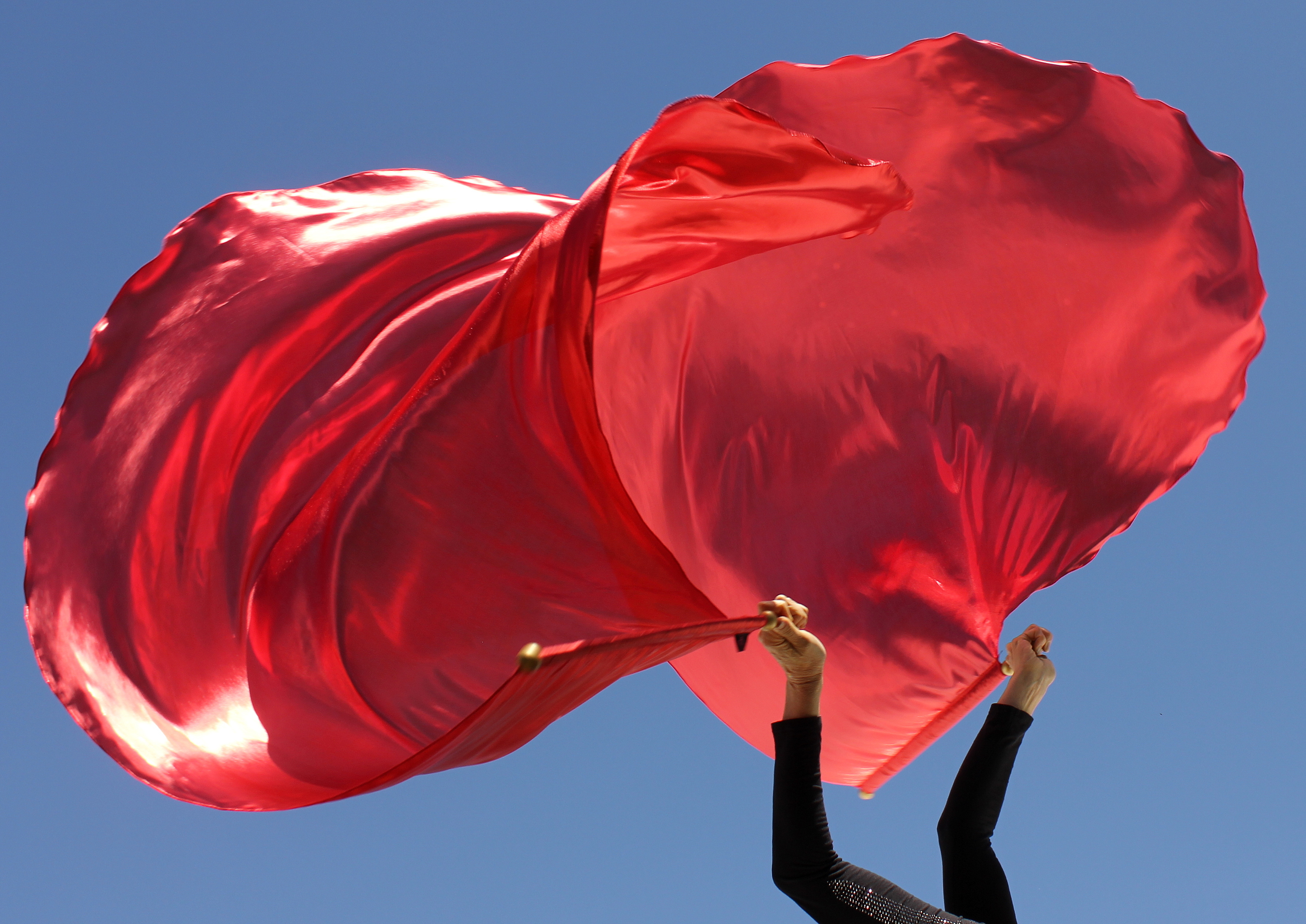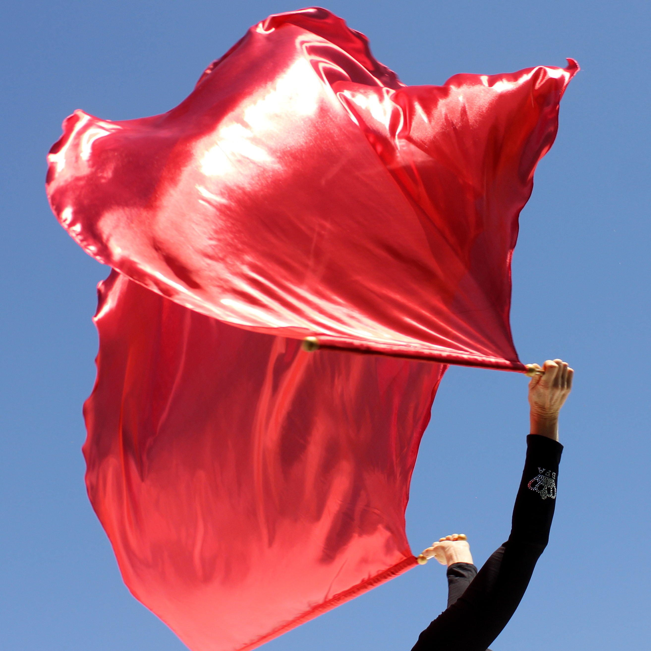 These are great worship flags for any age including children and the elderly or beginner flagger. They spin around on the rod easily and feature reinforced handles for easy cleaning. They are cut in an angel wing shape so no matter how you spin them they will still look pretty even if you are a novice. The sticks and other wood parts are hand-painted either gold, silver, or bronze for a really pretty look. We can make these in any color depending on availability of the material. These are also fairly lightweight and easy to spin around.