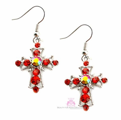 These beautiful crystal cross earrings are red with aurora borealis accents; suspending from fish hook style earrings in silvertone.